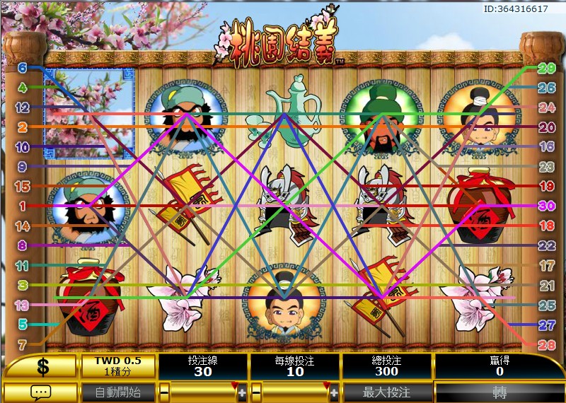 桃園結義角子機遊戲運用5個滾軸及三十條投註線的方式,加上含有免費遊戲及一個紅利遊戲的功能,讓您有機會從中獲得額外的獎分。 桃園結義角子遊戲在基本遊戲上設有一個百搭圖案, 除"桃花園"分散圖案之外漢字圖案"義"可以代替所有的圖案,3個或以上分散的"桃花園"圖案可觸發桃園結義免費遊戲。3個或3個以上從最左至右順序連續 排列的“張飛” 圖案可獲得桃園結義紅利遊戲。