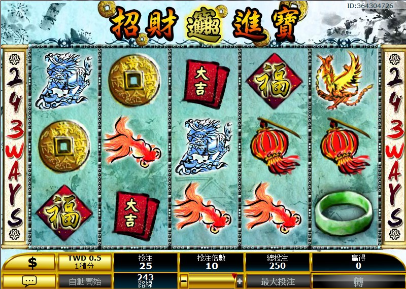 招財進寶角子機遊戲是一款基本的3x5軸角子機遊戲, 有243路線去贏取獎分,及附有“免費遊戲讓您有機會從中獲得額外的獎金。基本遊戲的百搭圖案‘女財神’, 除分散圖案外, 可取所有其他圖案。百搭圖案‘女財神’出現在遊戲的2,3,4及5軸上。在滾軸上任何地方出現三個或者更多'招財進寶'圖案將觸動招財進寶免費遊戲。