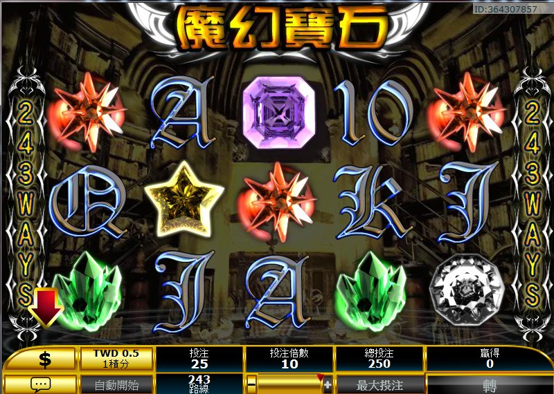 - 當帶有免費遊戲的“彩鑽”圖案出現在屏幕時將觸發魔幻寶石免費遊戲。