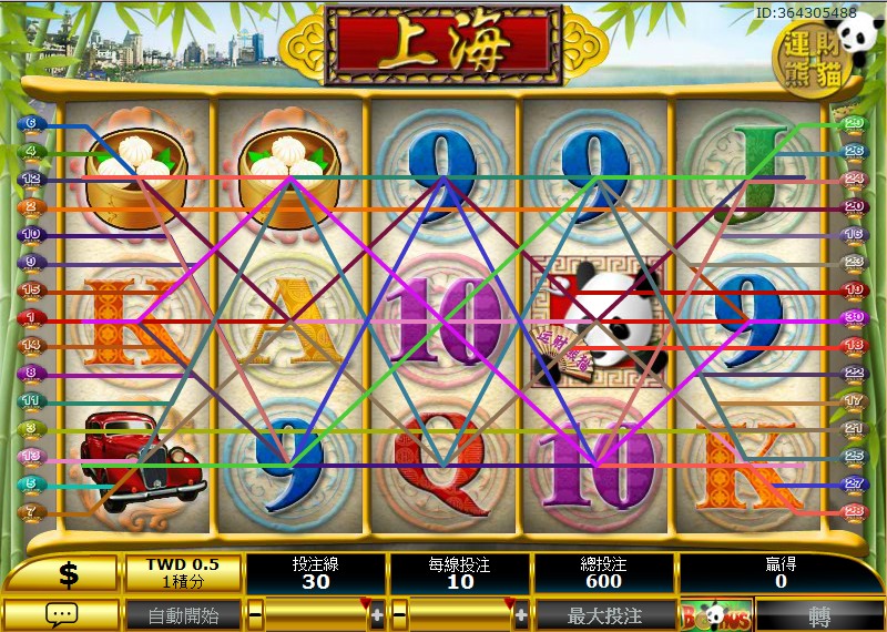 上海角子機遊戲是一款5軸、30條投注線的遊戲,加上含有“免費遊戲”,讓您有機會從中獲得額外的獎賞。透過押下“運財熊貓”附加紅利, 可提高中獎的機會及獲得更多的獎賞。在滾軸上任何地方出現三個或者更多的分散圖案“上海”, 將觸動免費遊戲。 基本遊戲及免費遊戲中有一個百搭圖案 “熊貓”, 除分散圖案“上海”之外, 可以取代所有圖案。