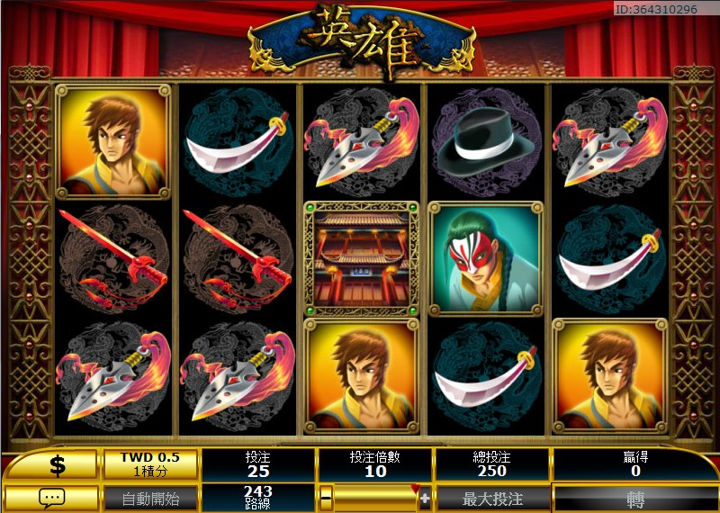 英雄角子機遊戲是一款5軸的遊戲,及附有“免費遊戲”和“英雄”紅利遊戲讓您有機會從中獲得額外的獎金。基本遊戲的百搭圖案‘健’, 除分散圖案外, 可取所有其他圖案。百搭圖案‘健’ 出現在遊戲的2,3,4及5軸上。在滾軸上任何地方出現三個或者更多'中華樓'圖案將觸動英雄免費遊戲。三個或者更多‘英雄’圖案將觸動 “英雄”紅利遊戲。基本的3x5軸角子機遊戲有243路線去贏取獎分。